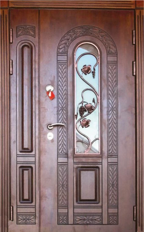 Поскольку в большинстве случаев устанавливаемые на входе в коттедж двустворчатые двери являются еще и предметом интерьера, украшающим здание, их дизайну предается особое значение. Эти двери, как правило, отделываются атмосферостойким МДФ, натуральным шпоном, массивом. Эффектно на таких дверях смотрится витражный узор, применение ковки, зеркальных элементов. Вариантов декора входной двустворчатой двери масса, тут все зависит от пожеланий заказчика.